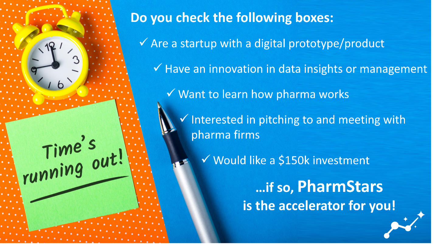 Are you a digital health startup looking to sell to pharma? Don’t miss the opportunity to apply to PharmStars’ Fall cohort focused on “Innovations in Data Management and Insights.”